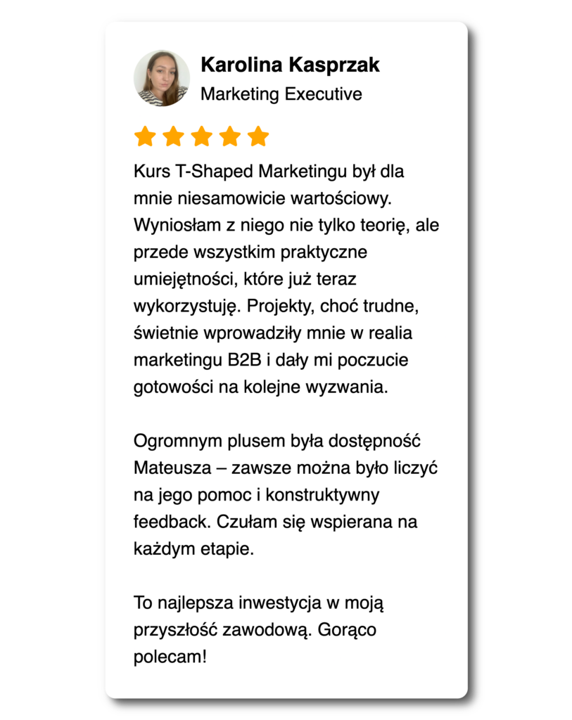 Jeśli pracujesz w agencji marketingowej obsługującej firmy B2B, to kurs T-shaped pozwoli Ci na serwowanie znacznie bardziej kompleksowych rozwiązań klientom oraz pełniejszą realizację ich strategii.